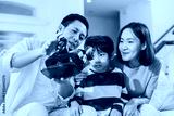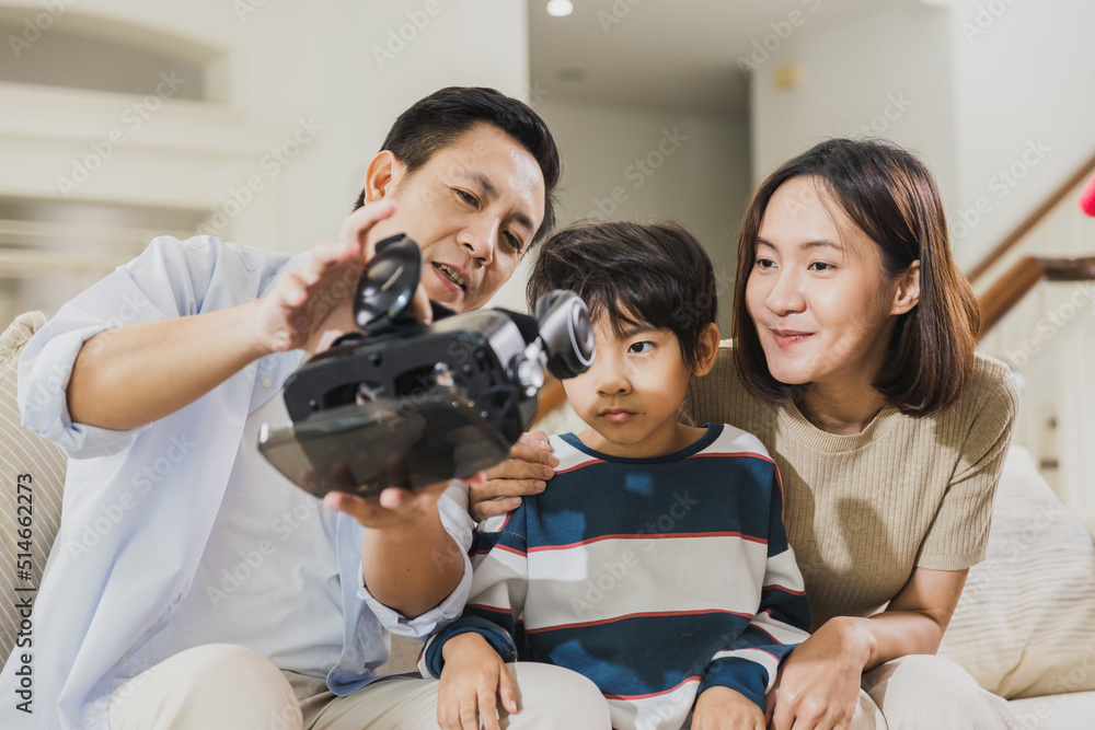 Asian generation family enjoy technology device hand use vr goggle glasses play fun together on sofa living room at home