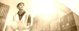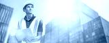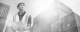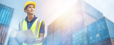 Smiling Portrait of man engineer in yellow hard hat, working on laptop Computer. Inspector or Safety Supervisor in Container Terminal, shipping transportation worker work at shipping