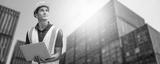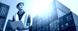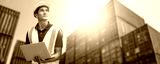 Smiling Portrait of man engineer in yellow hard hat, working on laptop Computer. Inspector or Safety Supervisor in Container Terminal, shipping transportation worker work at shipping