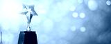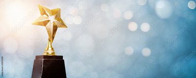 golden trophy award bokeh soft blue background. copy space for text. Winner or 1st place gold trophy award concept