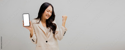 Cute and beautiful Asian confidential woman present and show mobile phone with white screen copy space, positive natural lovely Thai business girl teenager in suit isolated in studio.