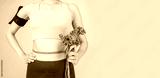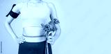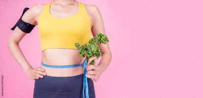 Fitness woman holding vegetable and tape measure bind around her waist Beautiful girl eating healthy food for diet and young lady get good health Healthy female wear sportswear with pink background