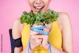 Fitness woman holding vegetable and tape measure bind around her hands Beautiful girl eating healthy food for diet and young lady get good health Healthy female wear sportswear with pink background