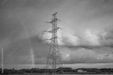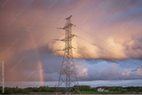 Power lines in the field. Landscape with power line and rainbow in the background. The concept of renewable and green energy. Sustainable and green electricity with cheap costs. Rainbow and beautiful