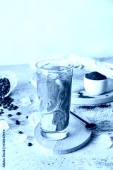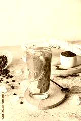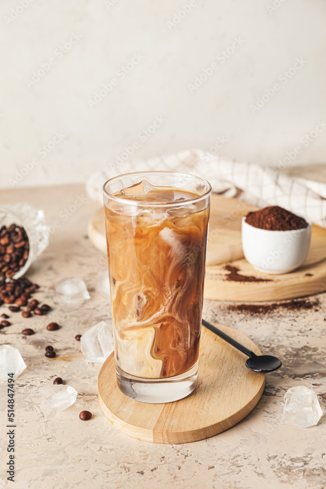 Wooden board with glass of delicious cold brew coffee and milk on grunge table