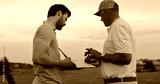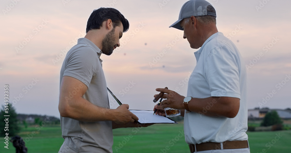 Golf men sign document contract on golfing course. Two businessmen make deal.