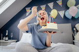 Sad, upset woman in pajama and party cap eating by spoon her birthday cake sitting on the bed in decorated bedroom. Celebrates birthday alone. Jamming of negative emotions. Selective focus.
