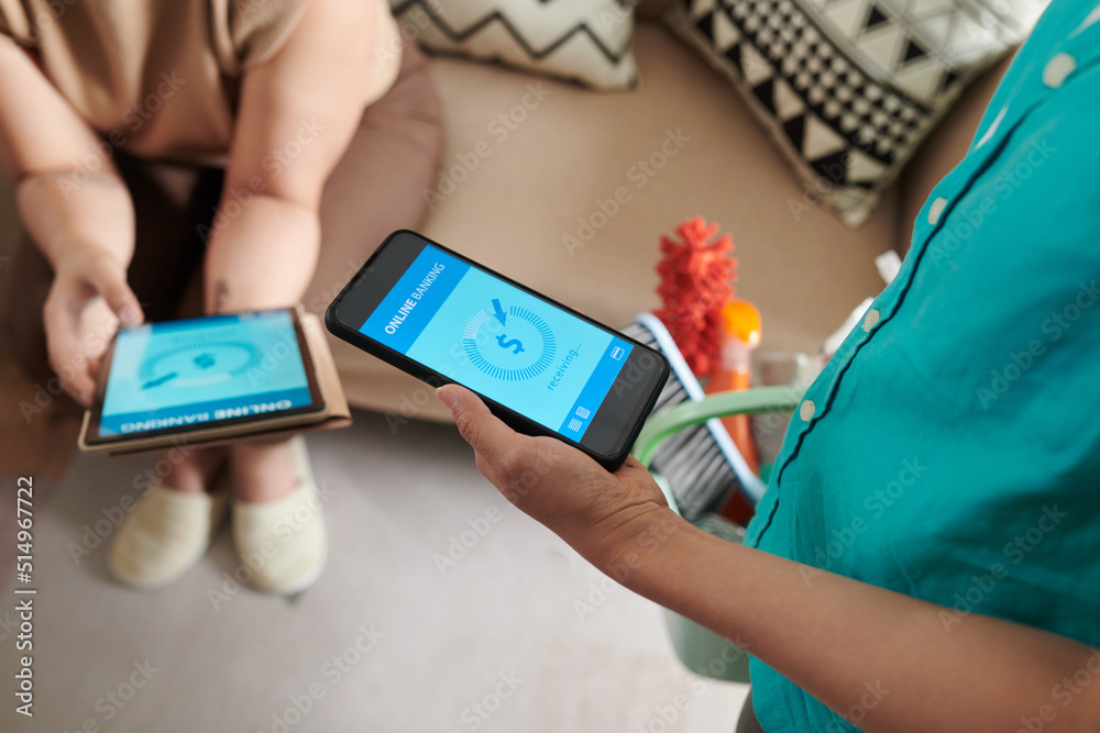 Close-up of cleaning service worker getting payment for her services online on mobile phone