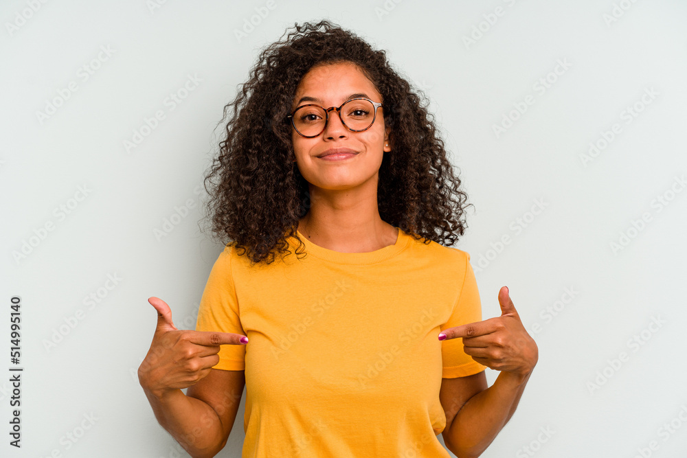 Young Brazilian woman isolated on blue background person pointing by hand to a shirt copy space, proud and confident