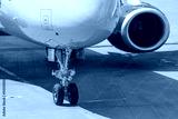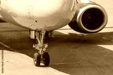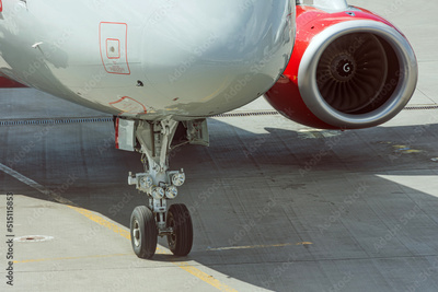 The nose gear, nose, and engine of the aircraft. Parking view.