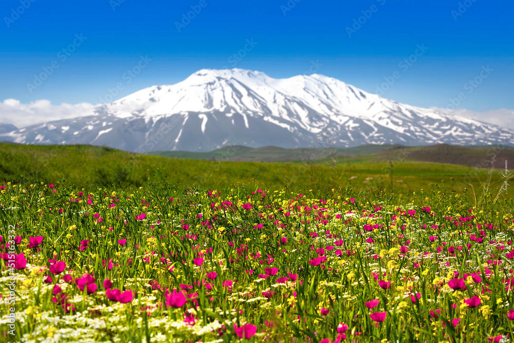 Mount Ararat (Turkey) at 5,137 m viewed from Yerevan, Armenia. This snow-capped dormant compound volcano consists of two major volcanic cones described in the Bible as the resting place of Noah's Ark.