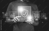 Youngman hand working with smart phone show visual screen innovation insurance online for car, travel, family and life, financial and health insurance. Insurance concept.