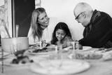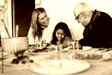 Happy grandparents eating with grand-daughter at home patio - Focus on grandmother face