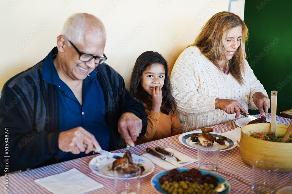 Happy grandparents eating with grand-daughter at home patio - Focus on little girl face