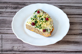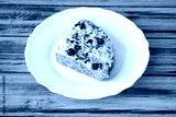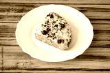 Liver cake close-up with mayonnaise on a white plate on a wooden surface.