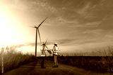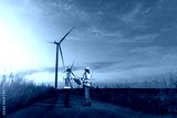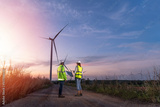 Engineer wearing uniform ,helmet inspection and survey work in wind turbine farms rotation to generate electricity energy. Green ecological power energy generation wind sustainable energy concept.