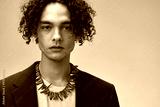 Serious stylish awesome tanned curly man in classic brown jacket ethnic necklace posing isolated on over beige pastel background. Fashion New Collection offer. Retro style concept. Free place for ad
