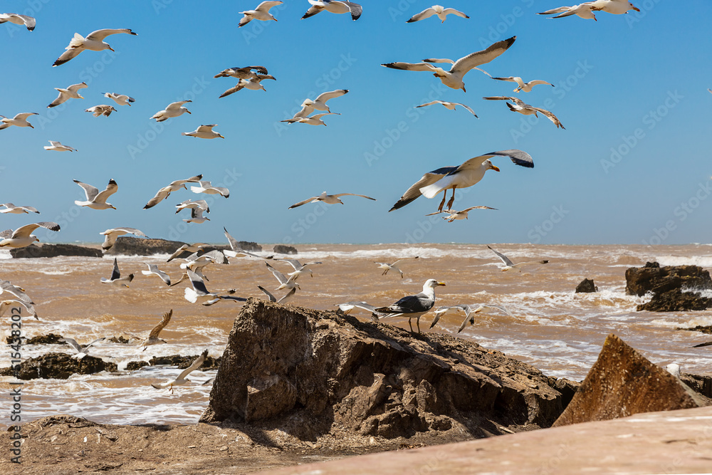 A lot of seagulls on the shores of the Atlantic Ocean, the city of Essaouira. Morocco