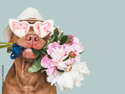 Lovable, pretty brown puppy and bright flowers