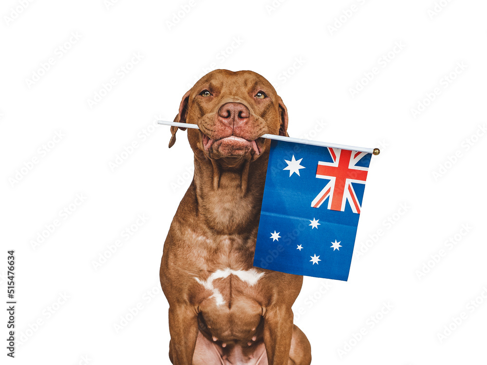 Lovable, pretty dog and Australian Flag. Closeup