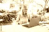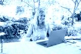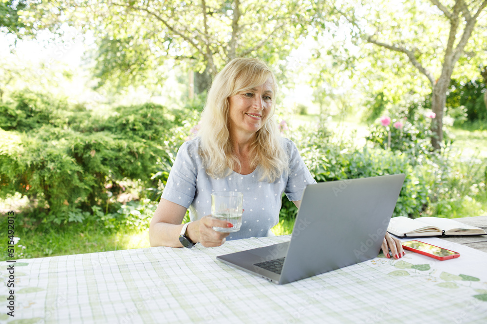 Smiling mature woman having video call via computer in the home garden office. Online team meeting video conference calling from home. Attractive Businesswoman Telework. Business video conferencing.