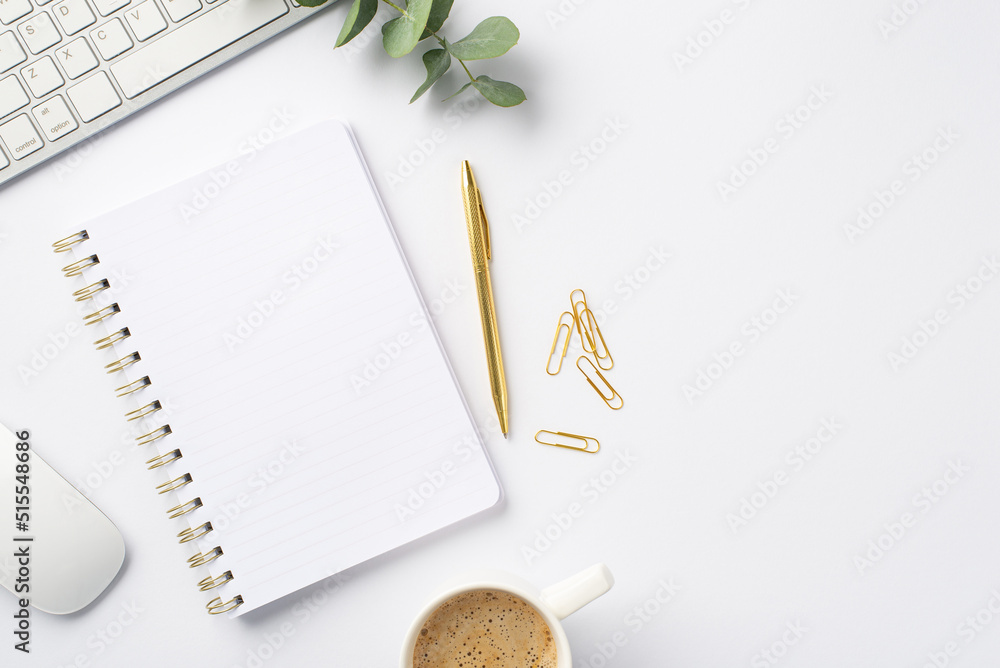 Business concept. Top view photo of workstation white keyboard computer mouse open notebook cup of coffee clips gold pen and eucalyptus sprig on isolated white background