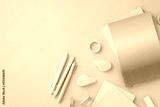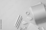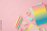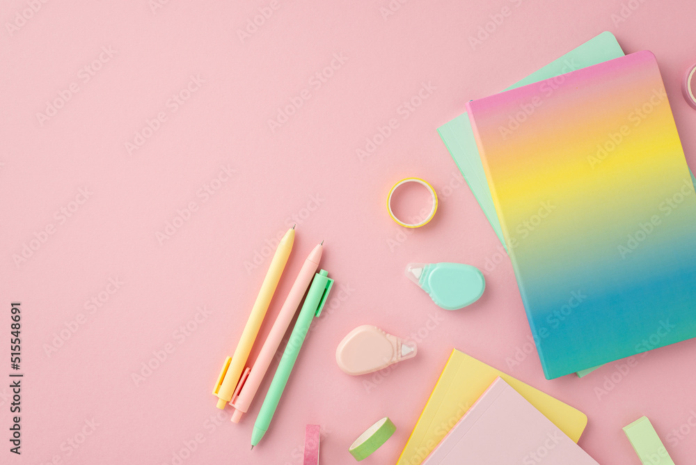 School accessories concept. Top view photo of colorful stationery rainbow color diary pens round correction tape ruler and adhesive tape on isolated pink background