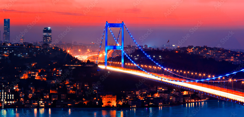 15th July Martyrs Bridge (15 Temmuz Sehitler Koprusu). Istanbul Bosphorus Bridge at night. Istanbul, Turkey.