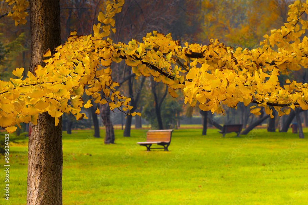 Park landscape in autumn. Autumn landscape on a sunny day. People strolling in the park in sunny weather. colorful trees show the beauty of the autumn season. Botanical park, Bursa, Turkey.