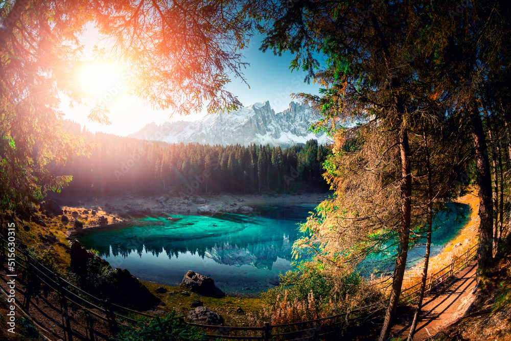 Wonderful typical alpine landscape (Lago di Carezza) in the Dolomites, South Tyrol. Latemar mountains and a pine forest are reflected in the clear lake at sunset. No people, peace and quiet.