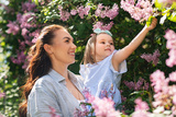 family, motherhood and people concept - happy mother with little daughter touching lilac flowers at summer park or garden