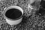 Taza de café con granos de café tostado con una cafetera al lado. Concepto de alimentos.