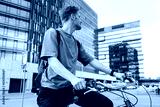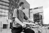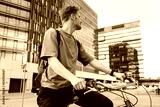 Young man riding a bike. Sustainable micro mobility transport New way of inclusive cities mobility. Green transportation. Sustainable climate neutral city goals. Green mobility and transportation