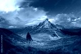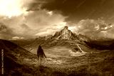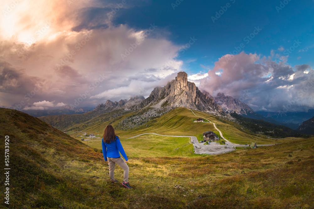 Giau Pass at daylight. Road to the mountain. Clear sky. Italy