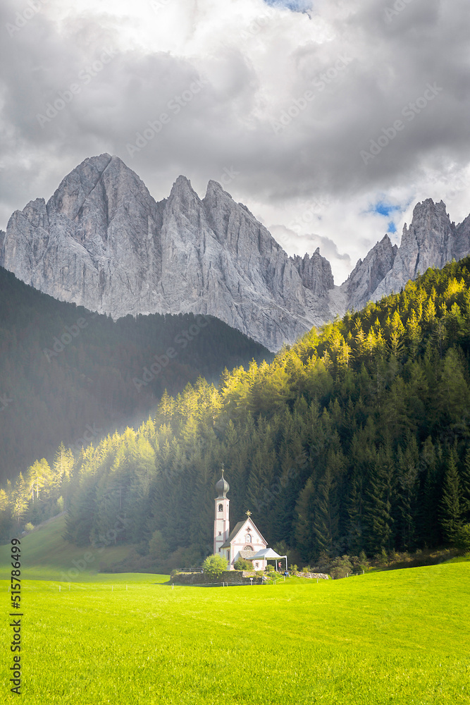 St. Johann in Ranui - a small church with onion tower in front of the Dolomite mountais Geissler massif in Santa Maddalena, Italy