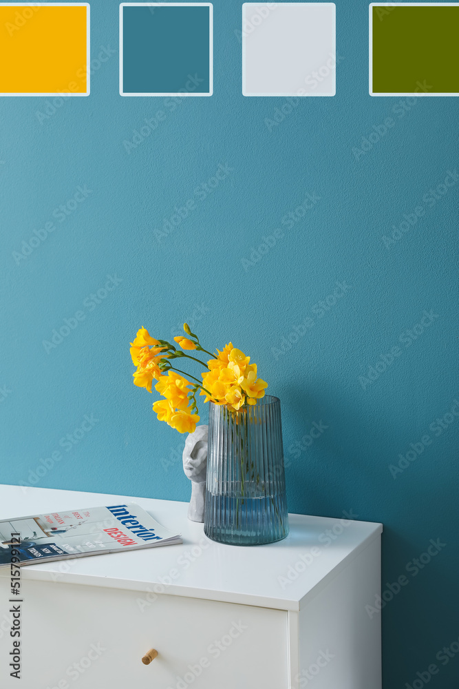 Vase with yellow flowers and magazine on table near blue wall in room. Different color patterns