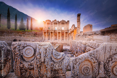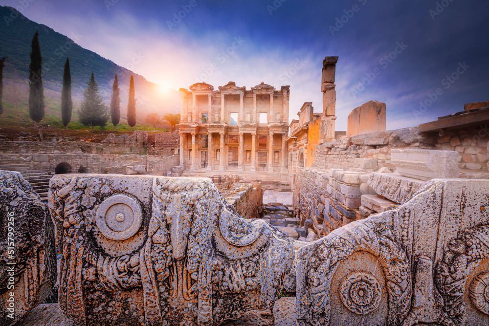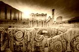 View of ruins in Ephesus (Efes). Scenic ruins of the ancient Greek city in Selcuk, Izmir Province, Turkey. Ephesus is a popular tourist attraction in Turkey.