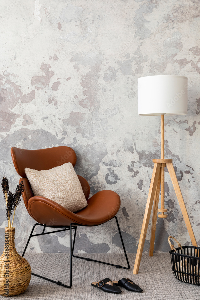 The stylish composition of wabi sabi interior with brown armchair, lamp and personal accesoories. Grey concrete wall. Home decor. Template.