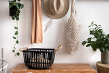 The stylish composition of cosy entryway with bench with basket, plants and personal accessories. Beige wall. Home decor. Template.
