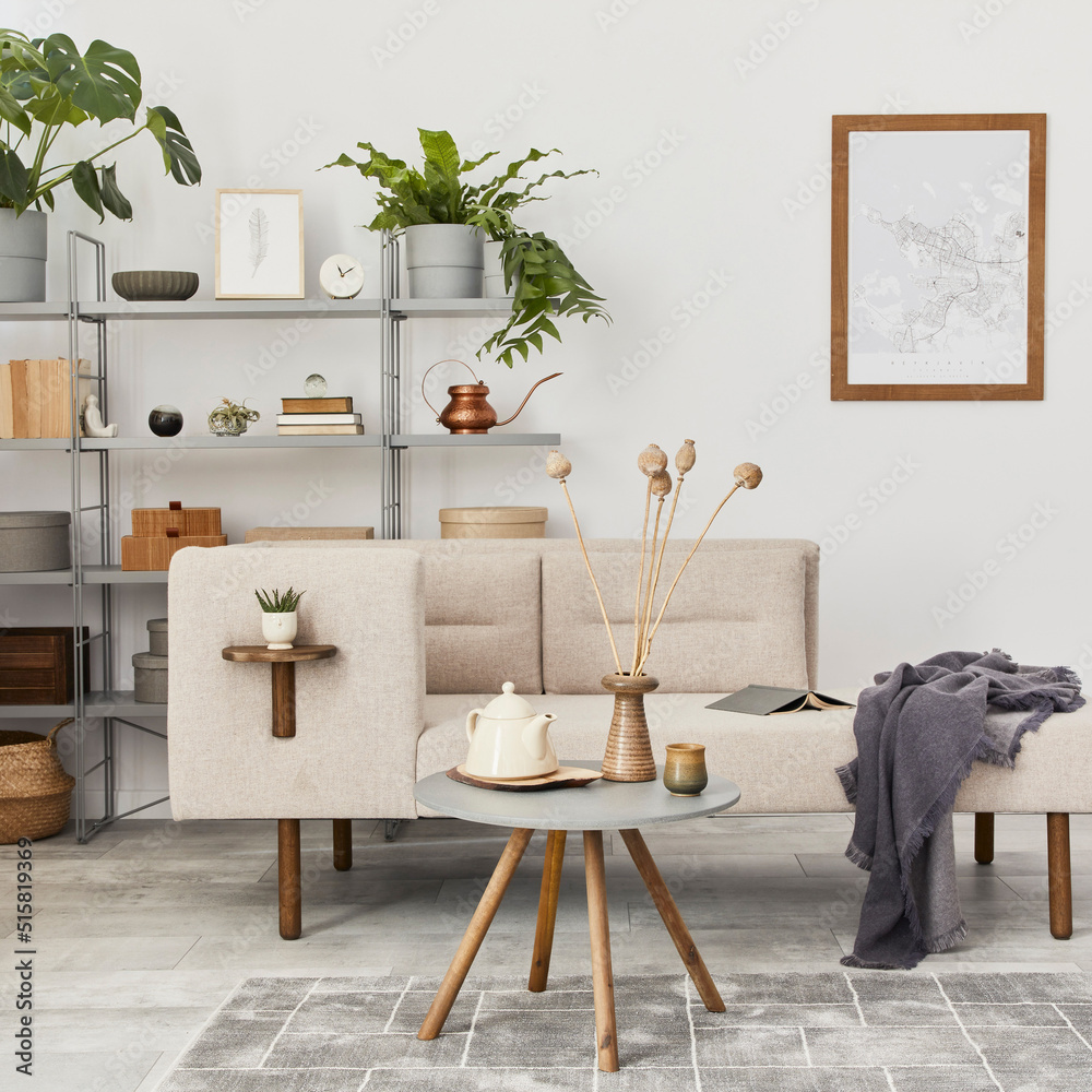 Cozy interior with stylish sofa, design coffee table, bookcase, plants, carpet, decoration, mock up poster map and elegant personal accessories. Neutral living room in classic house. Template.