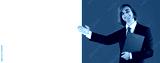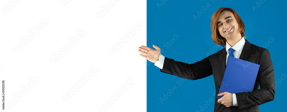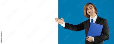 Young man Prep Student with long hair wearing a formal suit and tie. Portrait of guy holding blue folder