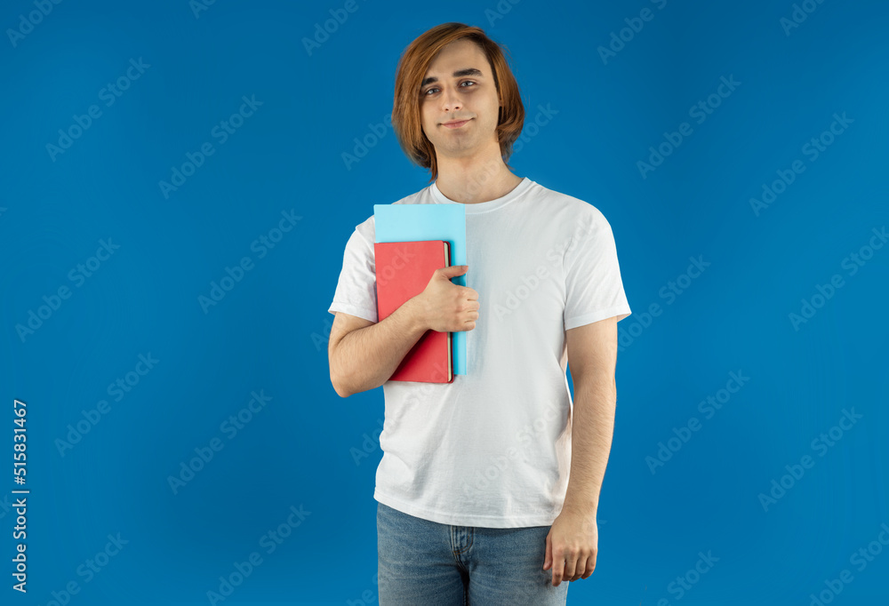 Young man Prep Student with long hair. Portrait of a guy with books on a blue background. Education preparing for exams concept