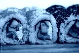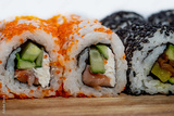 Close view of Sushi rolls in a Japanese restaurant. Appetizer Makizushi delicious traditional food of rice, seafood, avocado, fish salmon