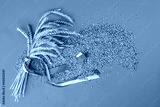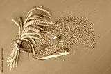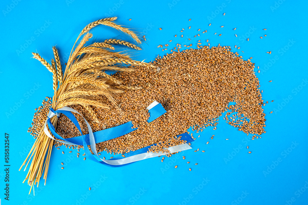 Festive bunch of ears of wheat, rye, barley tied with a white and blue ribbon. Harvest Grains on a blue background