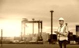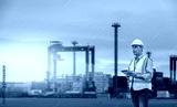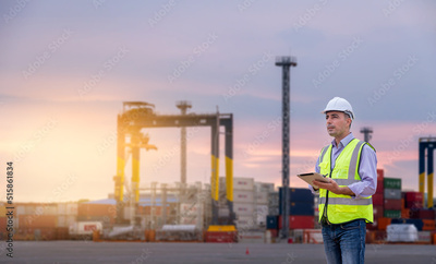 Engineer wearing uniform inspection and detail on tablet with logistics container dock cargo yard working crane bridge in shipyard transport logistic import export international logo background.