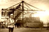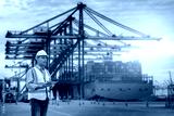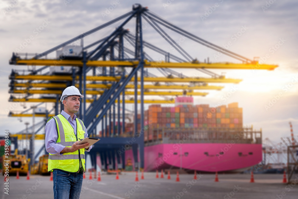 Engineer wearing uniform inspection and detail on tablet with logistics container dock cargo yard working crane bridge in shipyard transport logistic import export international logo background.