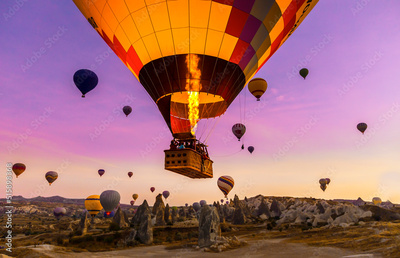 Colorful hot air balloons before launch in Goreme national park, Cappadocia, Turkey