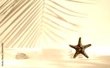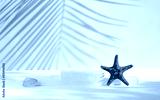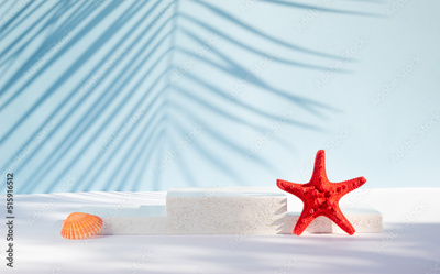 Modern product display on blue background with product podium, starfish, seashell and tropical palm leaf shadow. Suitable for Product Display and Business Concept.