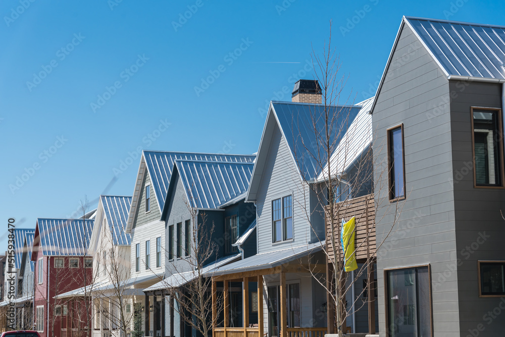 New development townhome with metal roof and covered gutters near Oklahoma City, US