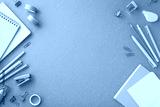 Back to school concept. Top view photo of blue stationery notepads adhesive tape binder clips pens pencil mini stapler sharpener and round correction tape on isolated blue background with copyspace